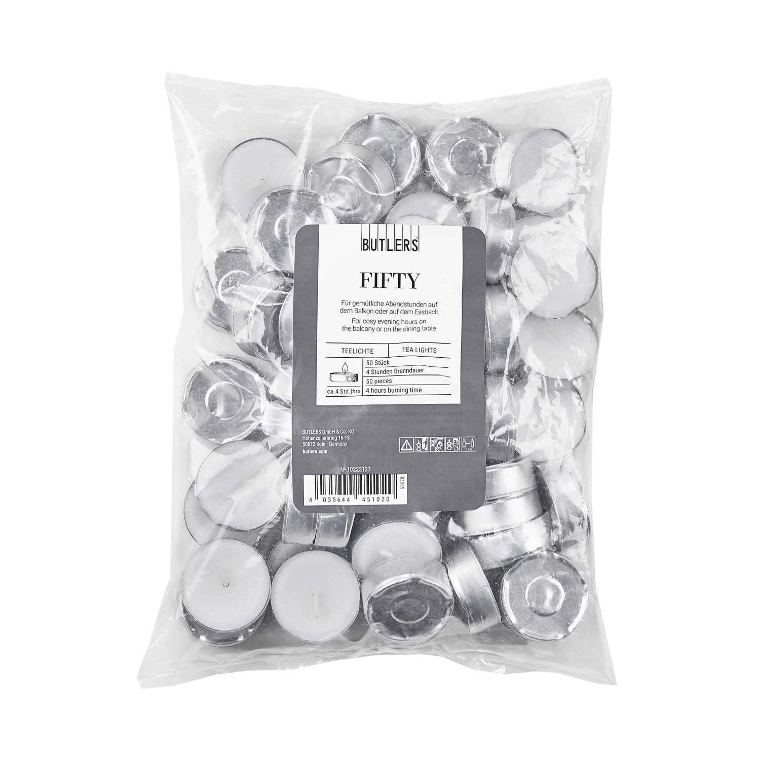 Für Teelichthalter, Windlichter, Stövchen, Rechauds und Tischdekos können Sie gar nicht genug Teelichter im Haus haben. Deshalb legen Sie mit dem Fifty Teelichte 50er Pack im 4er-Set einen praktischen Vorrat an – für insgesamt 800 Stunden Kerzenschein. Denn jedes der Teelichter aus Paraffin hat eine Brenndauer von 4 Stunden.