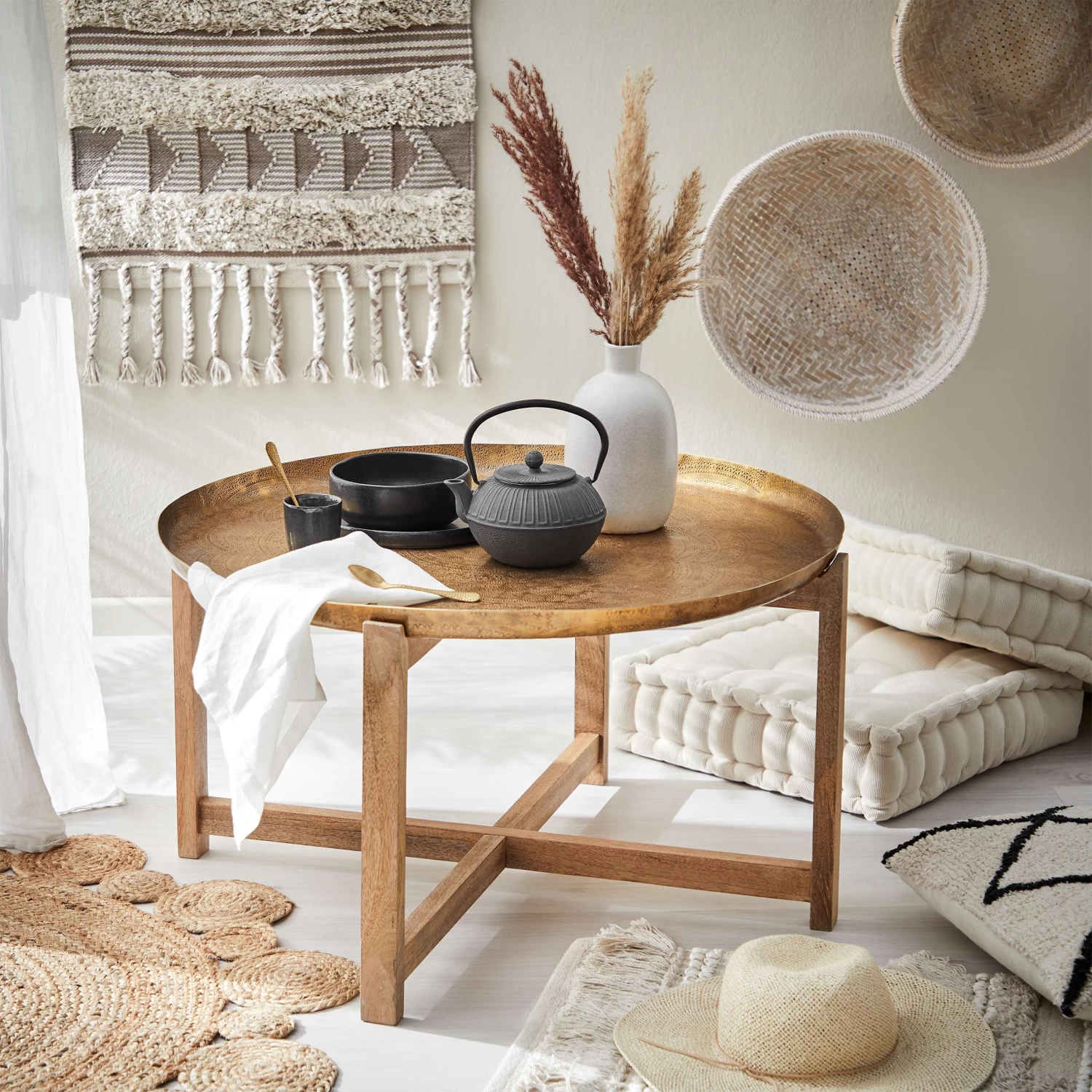 Zu Ihrer nächsten Tea Time lassen Sie sich auf Kissen oder Teppichen nieder und servieren Pfefferminztee auf dem Berber Beistelltisch. Solche niedrigen Tische werden traditionell für Teezeremonien verwendet, dienen in Ihrem Zuhause aber auch als Beistelltisch oder Couchtisch. Das dekorativ gestanzte Aluminium-Tablett mit orientalischem Muster ist dabei ein echter Hingucker, und das geradlinige, faltbare Gestell holt das Design ins Moderne.