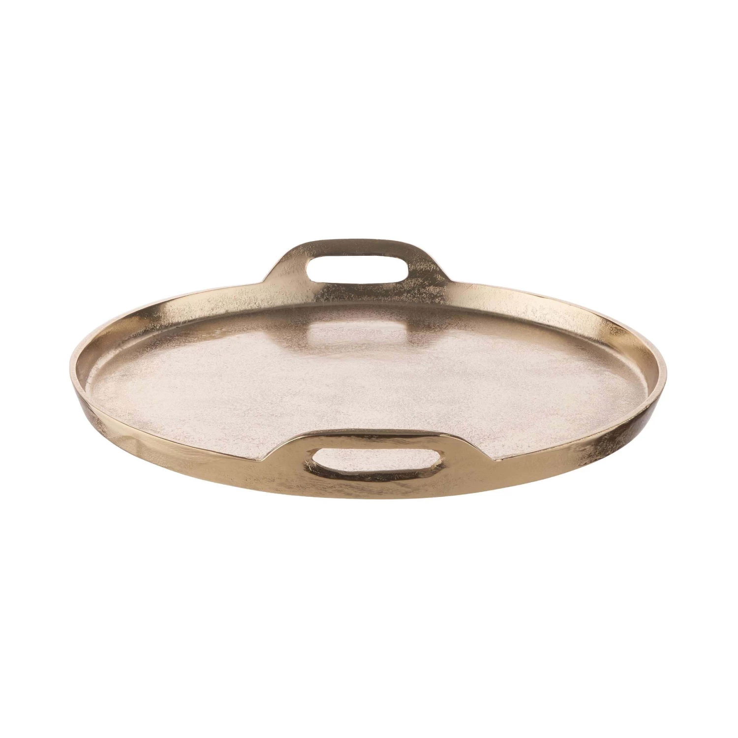 Mit dem Banquet Deko Tablett mit Griffen aus Aluminium in Gold schaffen Sie die elegante Grundlage für Ihre individuelle Deko: Einfach Kerzen, Windlichter, Vasen und andere ausgesuchte Objekte auf dem Tablett anordnen und dann auf einem Beistelltisch oder auf dem Esstisch platzieren. Auf der festlich gedeckten Tafel macht sich das Dekotablett mit 38 cm Durchmesser auch gut als Untersetzer für Flaschen und Karaffen. Mit Filzpunkten an der Unterseite zum Schutz empfindlicher Möbel.