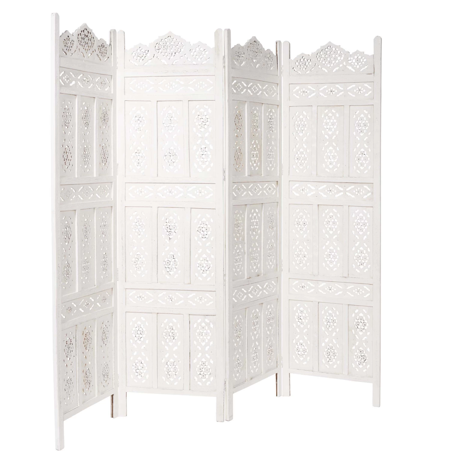 Als stamme er aus einer spanischen Finca, einer italienischen Villa oder einer portugiesischen Posada: Unser weißer Estella-Paravent mit femininen Ornamenten versehen, präsentiert sich charmant nostalgisch und aufwändig gearbeitet. Mit Liebe für das Detail. Denn er wurde von Hand gefertigt und bemalt. Ob als Raumteiler, als Sichtschutz oder Dekoelement: Der Paravent im Vintage-Look ist vielseitig nutzbar und weist deutliche Gebrauchsspuren auf.