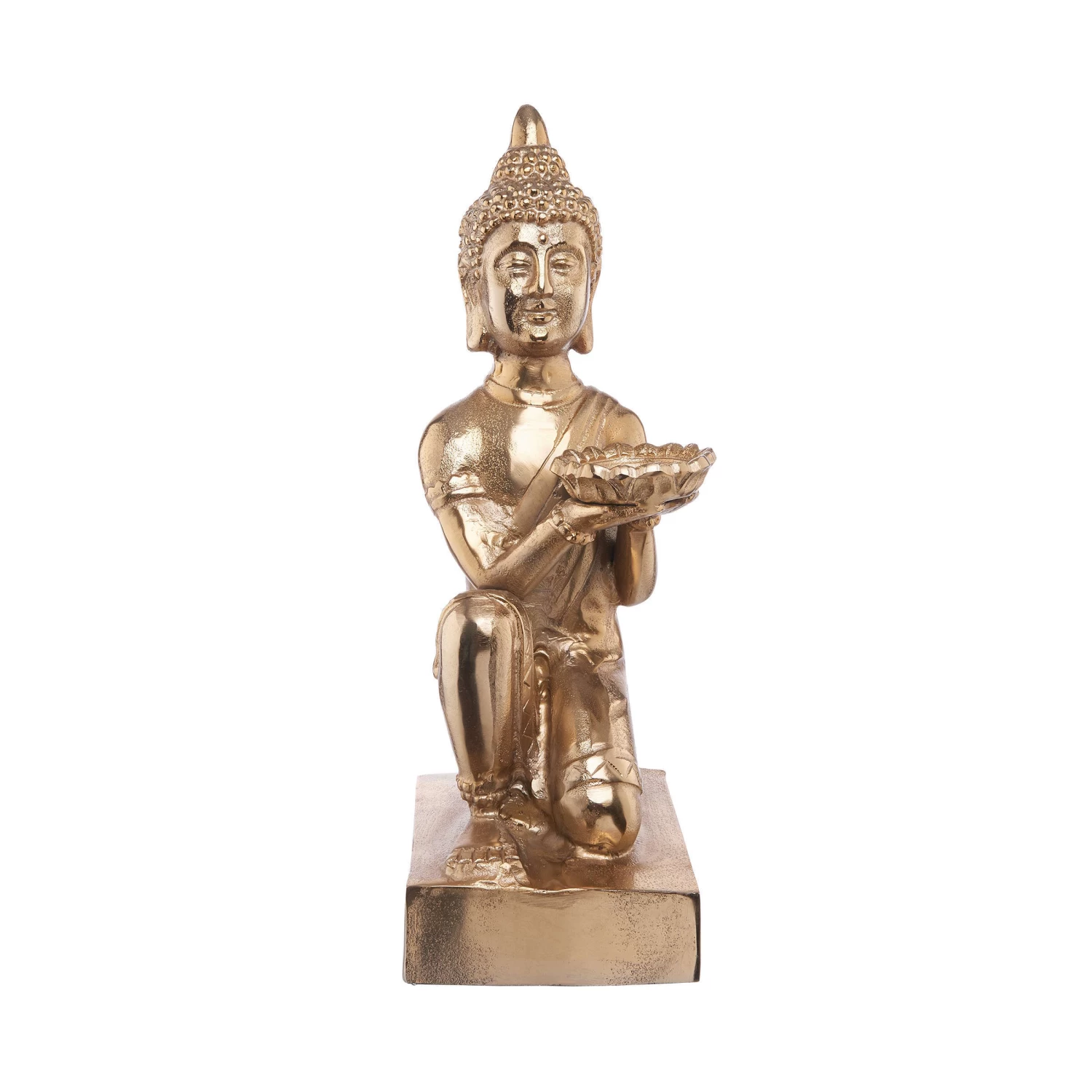 Ihr Fernweh leben Sie in diesen besonderen Zeiten in Ihrer Deko aus – und schmücken Ihr Zuhause mit der edlen Bali Buddha Statue aus Aluminium in Gold. Diese aufwändig gearbeitete Buddha-Figur hält eine kleine Schale in den Händen, in die Sie z.B. eine Blume oder ein Teelicht legen können. So setzen Sie einen stimmungsvollen Akzent, der mit Ihrer Deko im Asia-Stil harmoniert.
