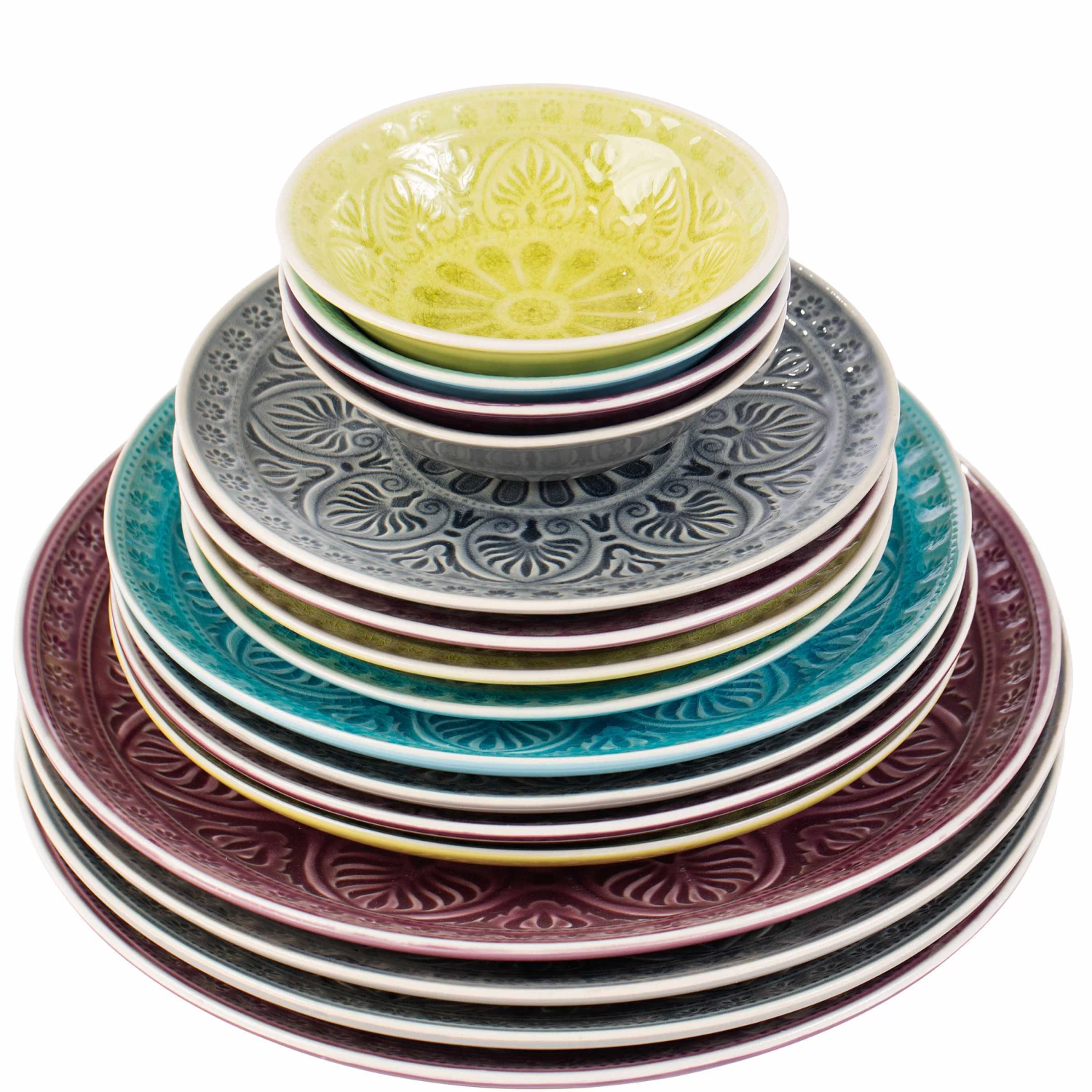Der prächtige, asiatische Sumatra Teller mit einem Durchmesser von 25 cm und traditionellem Dekor mit effektvoll glänzender Glasur. Der große Speiseteller aus Steinzeug ist ein echter Blickfang auf Ihrem gedeckten Tisch. Die kostbare Optik des bunten Tellers bietet einen feinen Kontrast zu den sehr scharf gewürzten Speisen, die man traditionell auf der Insel Sumatra reicht.